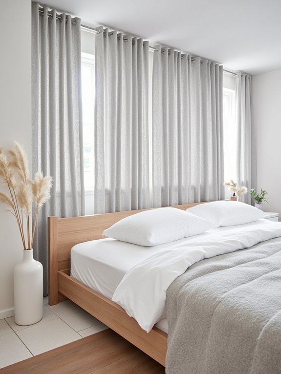 Layering sheer grey curtains with heavier drapes creates versatile light management throughout the day. The neutral grey palette complements existing wall colors and wooden elements, ensuring a cohesive look that enhances the room’s natural features without overwhelming the space.