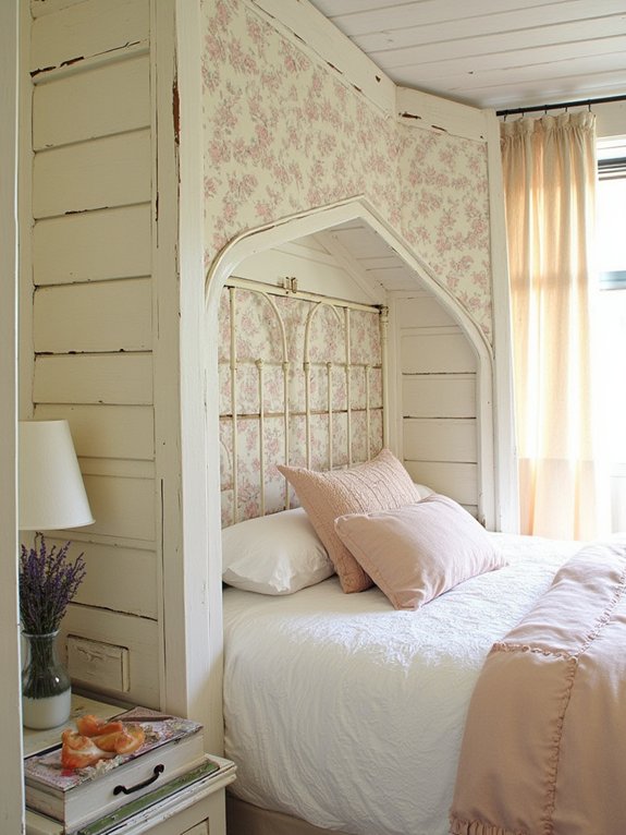A cozy vintage bed nook creates an intimate sleeping sanctuary when nestled against a wall or tucked into a corner. The foundation begins with a white-washed wooden bed frame, adorned with layers of soft vintage quilts and bedding in gentle cream and pink tones. Delicate floral linens and embroidered pillowcases add charm and character to the space.