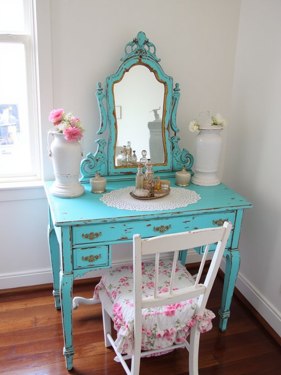 A distressed turquoise vanity table combines vintage elegance with coastal style, creating a perfect centerpiece for a shabby chic bedroom. Its weathered finish and time-worn appearance blend seamlessly with other distressed furniture pieces, while the distinctive turquoise color adds a fresh, beachy element to the space.