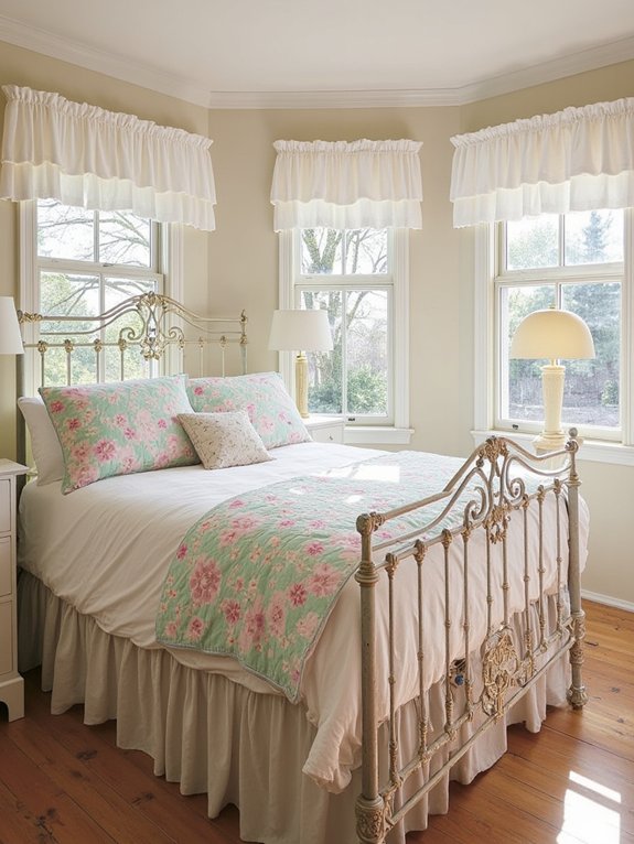 The valances complement floor-length curtains to create a complete window treatment that enhances the room’s romantic atmosphere. Their cream and blush tones, combined with floral patterns and cascading ruffles, bring a timeless shabby chic aesthetic that transforms any bedroom space into an airy, graceful sanctuary.