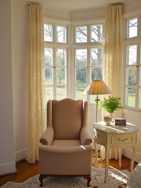 The design comes to life through careful attention to detail, featuring weathered white finishes, crystal-accented lighting, and delicate lace curtains that filter natural light. These elements work together to establish an intimate reading nook that balances refined elegance with cozy functionality.