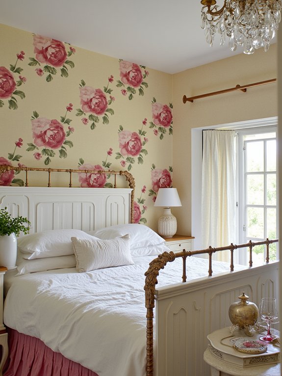 Vintage floral wallpaper creates a romantic focal point in bedrooms by transforming ordinary walls into eye-catching design elements. The timeless patterns, featuring soft, faded florals in muted pinks, creams, and sage greens, serve as an ideal foundation for shabby chic decor.