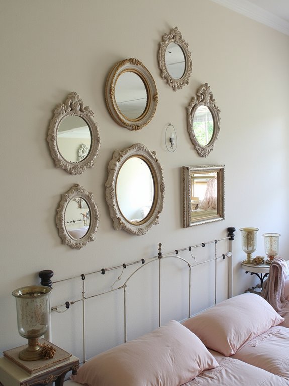 The strategic arrangement incorporates various mirror sizes and shapes, spaced 4-6 inches apart for optimal visual balance. Larger statement pieces of 24-36 inches mix with smaller 8-12 inch accents, adding depth and dimension while making the room feel more spacious and ethereal.
