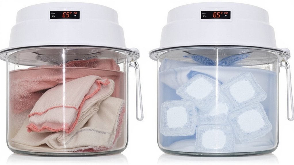 Hot water (130°F+) accelerates chemical reactions between detergents and dirt, making it more effective at sanitizing and deep cleaning. However, you’ll need to reflect on how heat affects your fabric fibers. Warm water (90°F-110°F) provides a good balance between cleaning power and fabric protection.