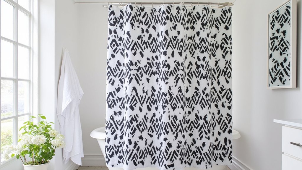 Switch gears from the soft charm of vintage florals to the striking appeal of a bold geometric design for your guest bathroom shower curtain. You’ll instantly transform the space with sharp lines and modern vibes. Opt for a curtain measuring 72×72 inches to fit standard showers, ensuring full coverage.