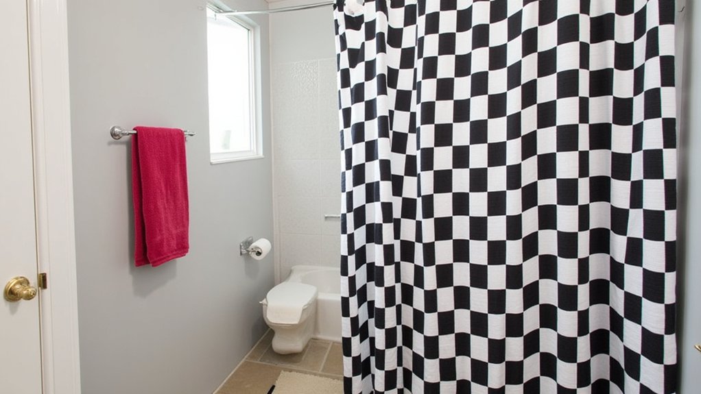 While minimalist designs offer calm, a retro checkerboard pattern brings bold energy to your guest bathroom. You can transform the space with this classic look that’s easy to install and style. Opt for a shower curtain, ideally 72×72 inches, in black-and-white checks for timeless appeal.