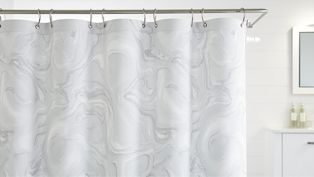 For a shift in style, consider an elegant marble effect shower curtain to elevate your guest bathroom’s look. It brings a classy, timeless vibe with swirling gray or white patterns mimicking real stone. You’ll transform a plain space into a luxe retreat instantly.