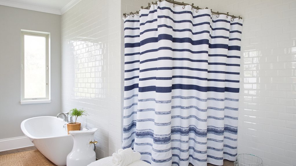 If you’re aiming for a timeless look, consider a nautical stripe design for your guest bathroom shower curtain. It’s a classic choice that adds crisp, clean vibes with navy and white stripes. You’ll love how it transforms your space into a coastal retreat within a 5×7-foot bathroom area.