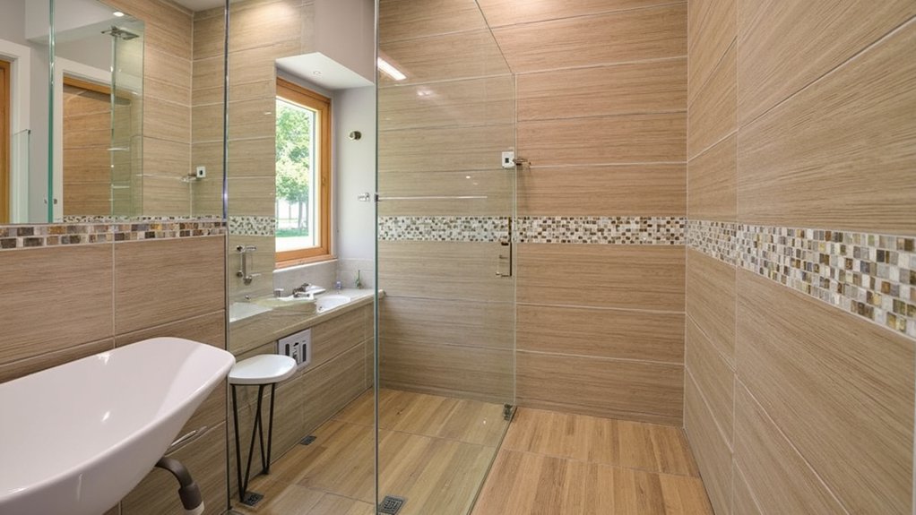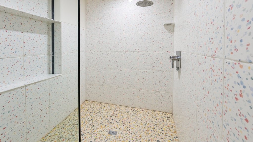 While geometric porcelain tiles bring sharp, modern lines to your shower, colorful terrazzo tiles add a playful, artistic vibe. You can transform your space with their speckled patterns and vibrant hues. Imagine installing 12×12-inch tiles in a 5×5-foot shower area for a bold statement. It takes about 2-3 days for a full installation.