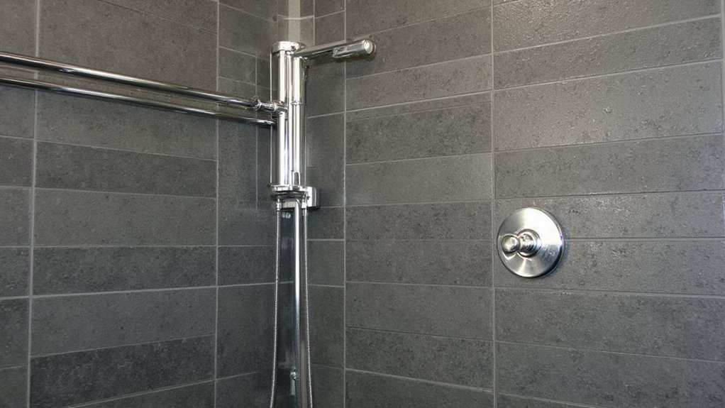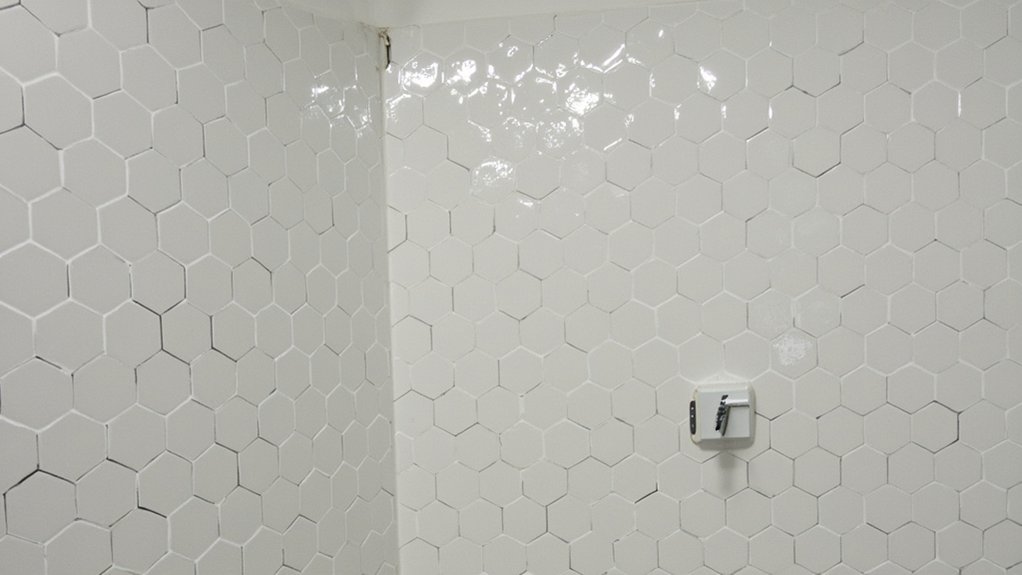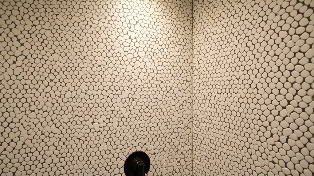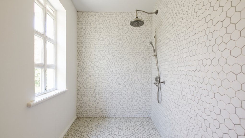 Switching gears from the earthy charm of textured slate, you’ll find geometric porcelain tiles offer a modern twist for your shower. These tiles, often 12×12 inches, create bold patterns like hexagons or chevrons. You can transform your space in just a weekend with the right prep.