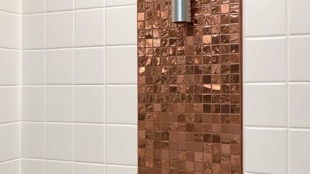 If you’re craving a bold, modern twist in your shower, consider metallic accent tiles for a striking update. These tiles, often in silver, gold, or copper finishes, catch light and add sleek style. Use them sparingly, like in a 12-inch vertical strip or a 6×6-inch niche, to avoid overpowering your space.