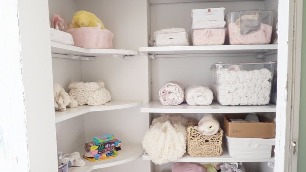 Installing corner shelving units in a nursery closet is a smart way to maximize unused space and create additional storage for baby essentials. Start by measuring the corner area of the closet to guarantee you purchase or build a shelving unit that fits perfectly without wasting space. Choose a unit with adjustable shelves to accommodate items of varying sizes, such as diapers, blankets, and toys.
