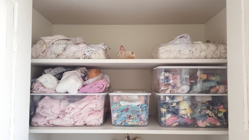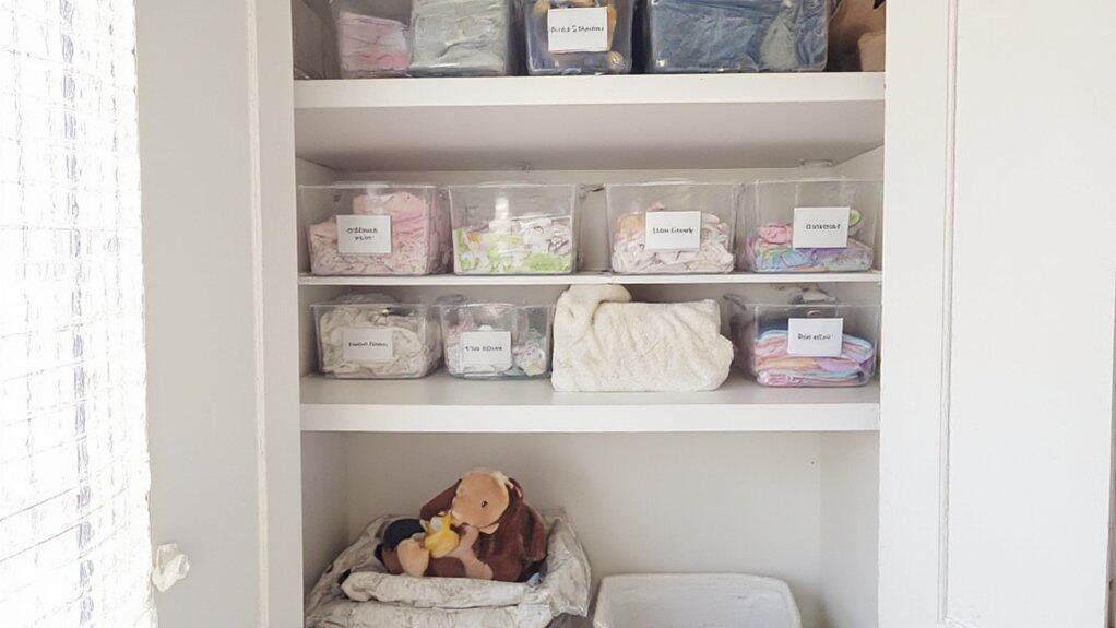 Labeled storage bins are a fantastic way to keep a nursery closet organized and easily accessible. Start by selecting bins of various sizes to accommodate different items, such as diapers, clothes, toys, or blankets, and make certain they fit neatly on the closet shelves or floor. Clearly label each bin with its contents using adhesive labels, tags, or a label maker for quick identification, reducing the time spent searching for specific items.
