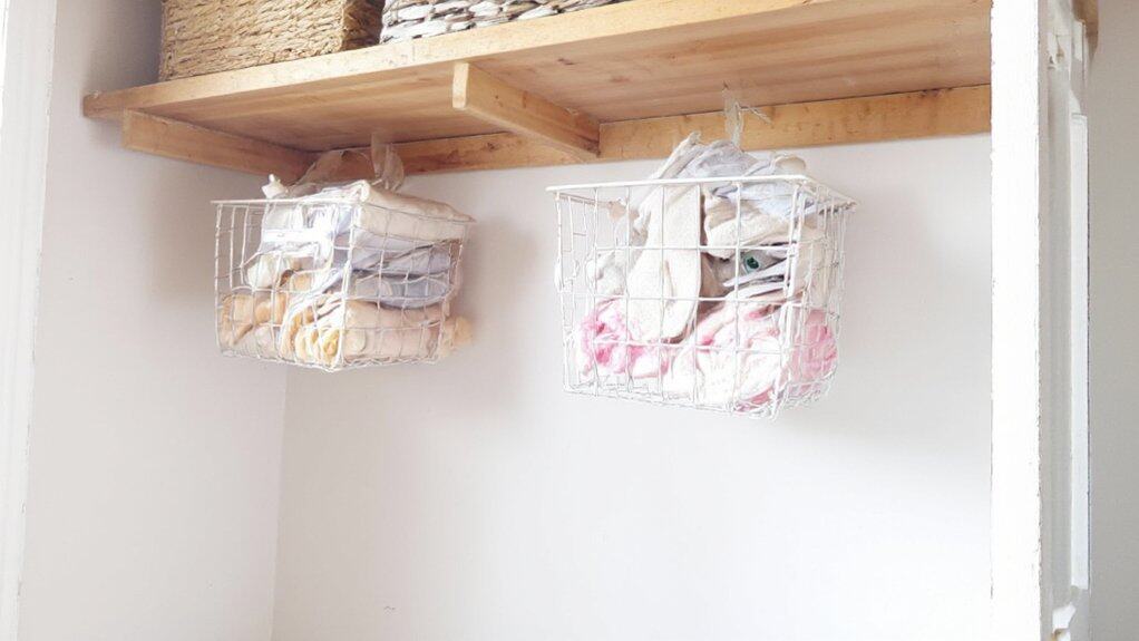 To get started, measure the dimensions of your shelves to guarantee the baskets fit securely, and opt for baskets with a sturdy design to hold various baby items. Label each basket for quick identification, especially for frequently used items, to streamline your daily routine. This simple addition can notably increase storage capacity and keep the nursery closet neat and functional.