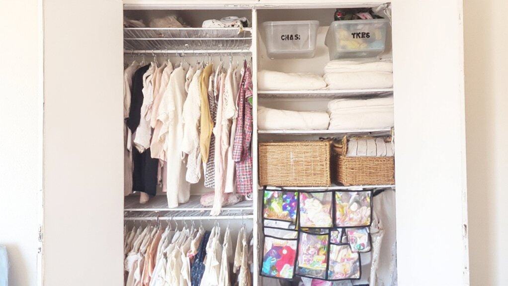 Hey there, as a new parent, you’re probably juggling a million things, and a messy nursery closet shouldn’t be one of them! I’ve been there, tripping over tiny socks at 2 a.m.—trust me, it’s no fun. Let’s start with utilizing vertical space; install adjustable shelves up to 6 feet high for stacking baby gear. But wait, there’s more to make your life easier. Stick around for game-changing tips!