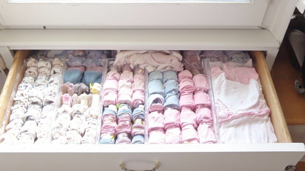 Installation is simple; place the dividers into the drawer and arrange them to form compartments based on the categories of clothing or accessories you’re storing. For instance, dedicate sections for pajamas, diapers, or burp cloths, folding each item neatly to maximize space and visibility. Regularly revisit and adjust the layout of the dividers as your child’s needs change, guaranteeing the organization system remains functional over time.
