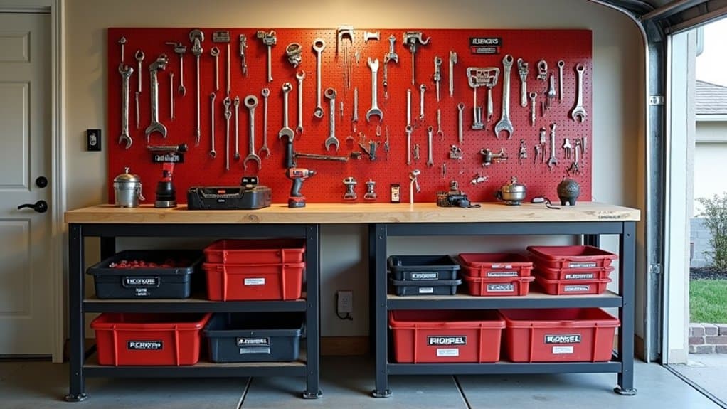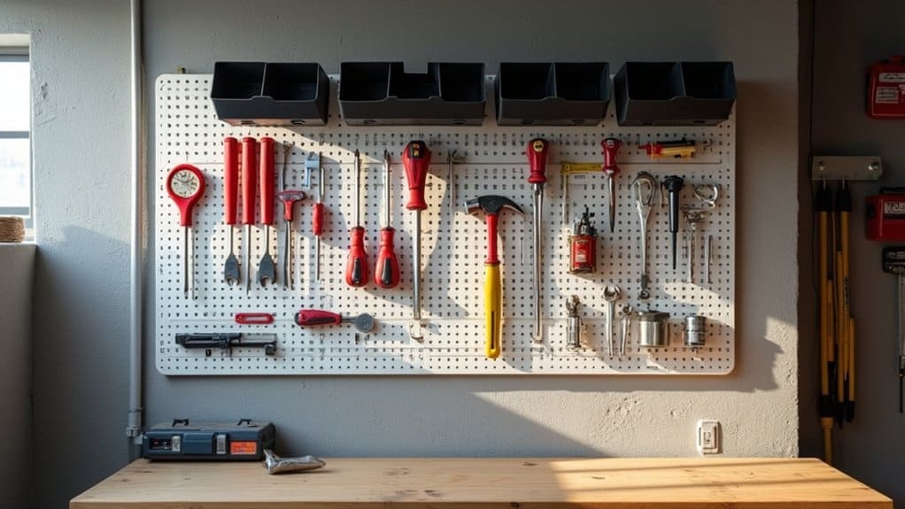 Once the pegboard is installed, arrange hooks, baskets, and shelves to accommodate your tools and equipment based on frequency of use. Place commonly used items like screwdrivers and hammers at eye level for quick access, while less-used tools can be stored higher or lower. Take time to label sections or outline tool shapes on the pegboard to maintain organization and guarantee everything returns to its designated spot after use.