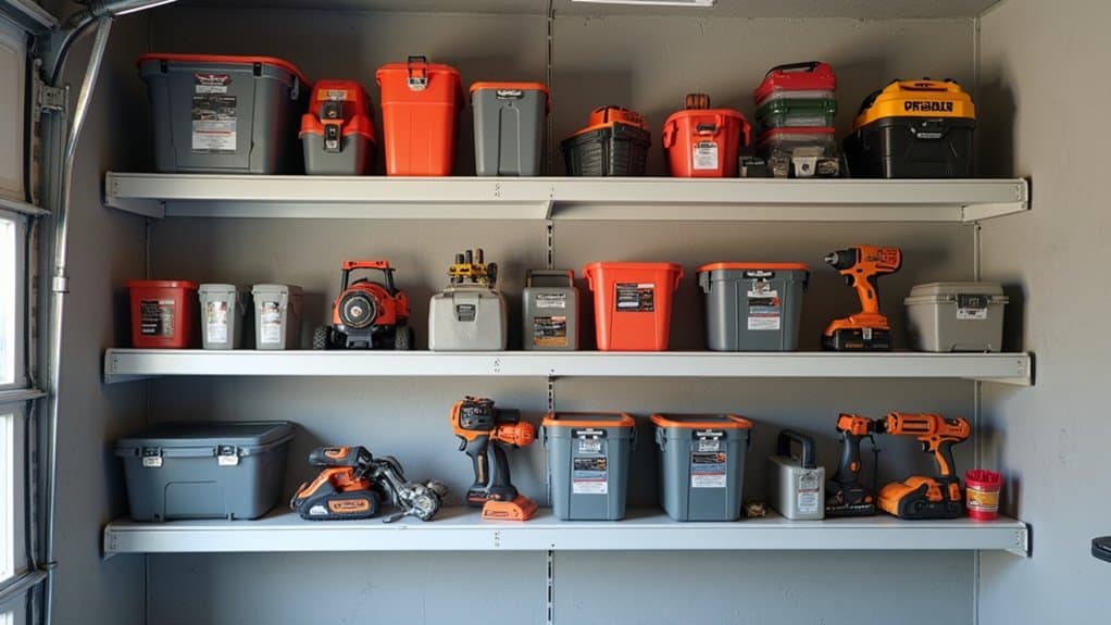 Installing wall shelves in your garage is a fantastic way to maximize vertical space and keep items off the floor. Begin by choosing a suitable wall area, ideally above a workbench or near a frequently used space, and measure the dimensions to guarantee the shelves fit well. Use a stud finder to locate wall studs for secure mounting, then mark and drill holes for shelf brackets or a wall-mounted shelving system.