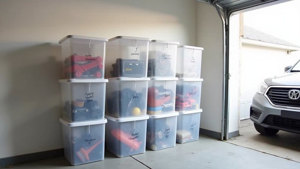 To optimize organization, place frequently used items in bins at eye level or lower, while storing less-used items higher up to save accessible space. Confirm the bins are securely stacked by following the manufacturer’s guidelines, and consider using bins with interlocking designs for added stability. Additionally, leave some empty bins or space in existing ones for future storage needs, preventing overcrowding and maintaining a tidy system.
