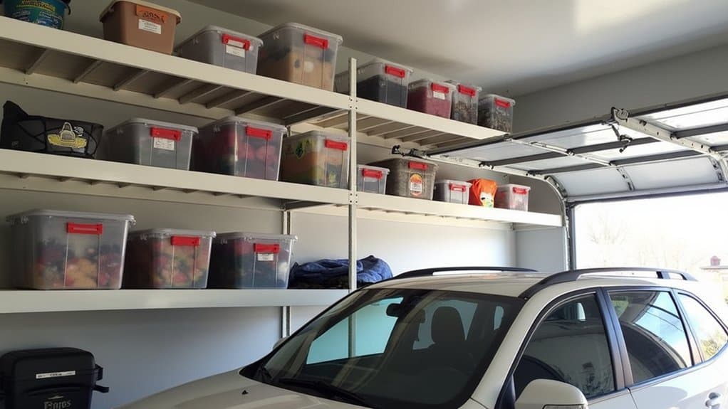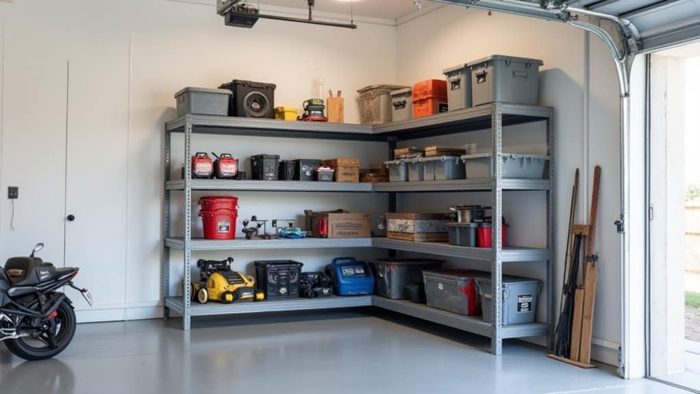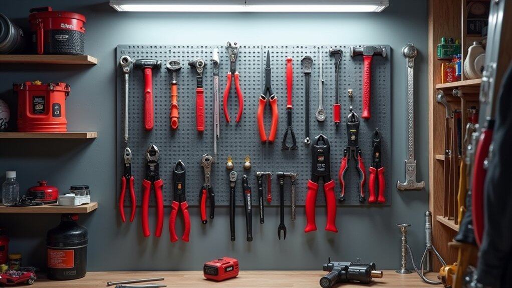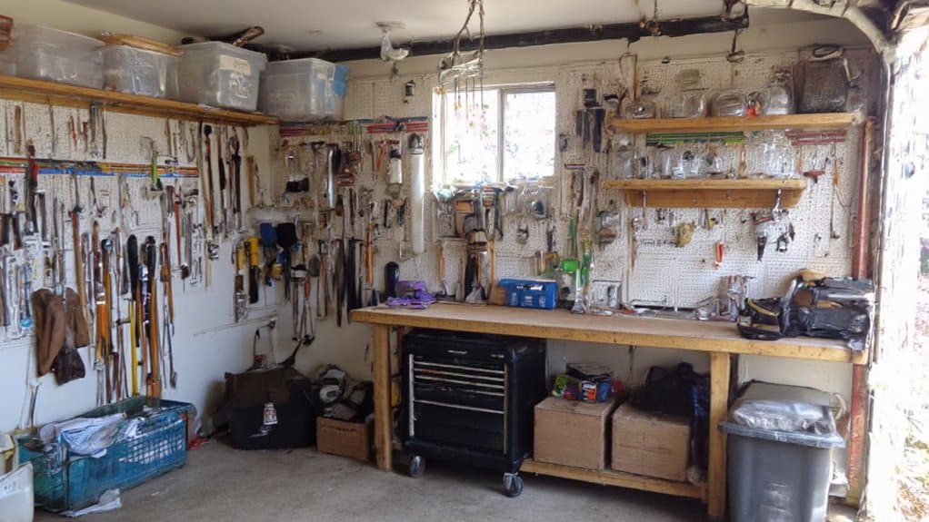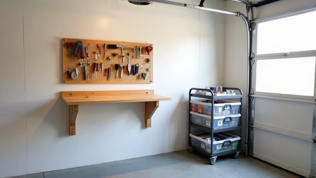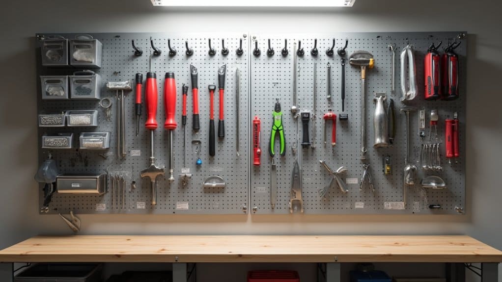 A pegboard organization system is a versatile and customizable solution for garage storage, perfect for keeping tools and small items easily accessible. Start by selecting a sturdy pegboard panel and mounting it securely to a wall in your garage, guaranteeing it is at a comfortable height for reaching. Use a variety of hooks, baskets, and shelves designed for pegboards to hang items like hammers, screwdrivers, and gardening tools, maximizing vertical space.