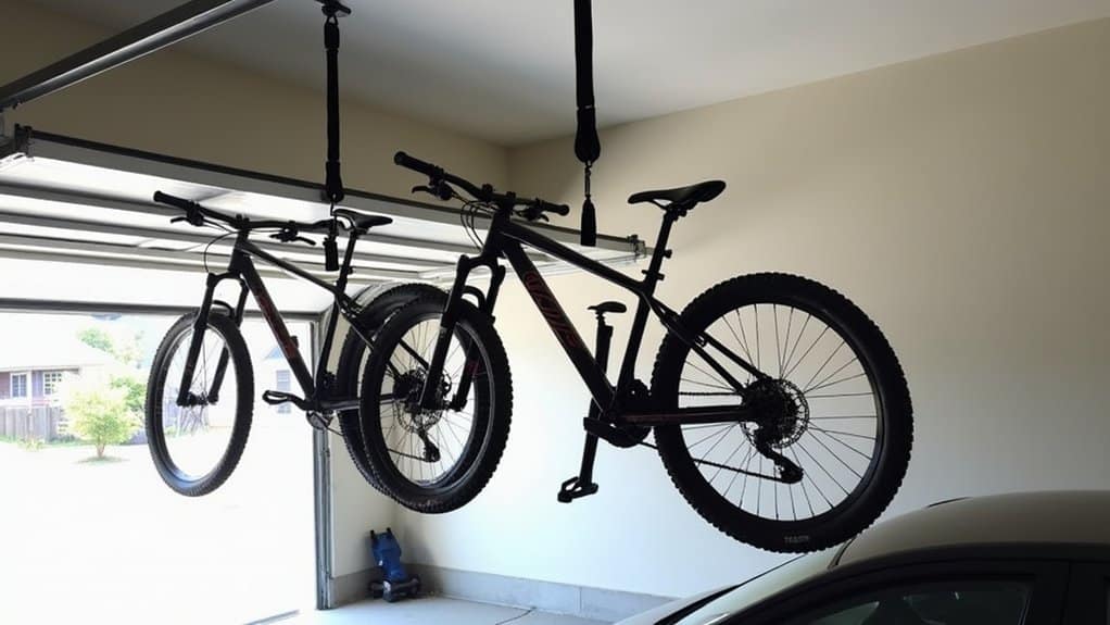 Ceiling bike hooks offer a fantastic solution for maximizing garage space by lifting bicycles off the floor and out of the way. To organize your bikes using ceiling hooks, start by selecting a sturdy location on the ceiling, ideally near a wall or in a corner, where the bikes won’t interfere with other stored items or vehicle access. Confirm the ceiling joists can support the weight, and use heavy-duty hooks or a pulley system designed for bike storage to securely hang each bicycle.
