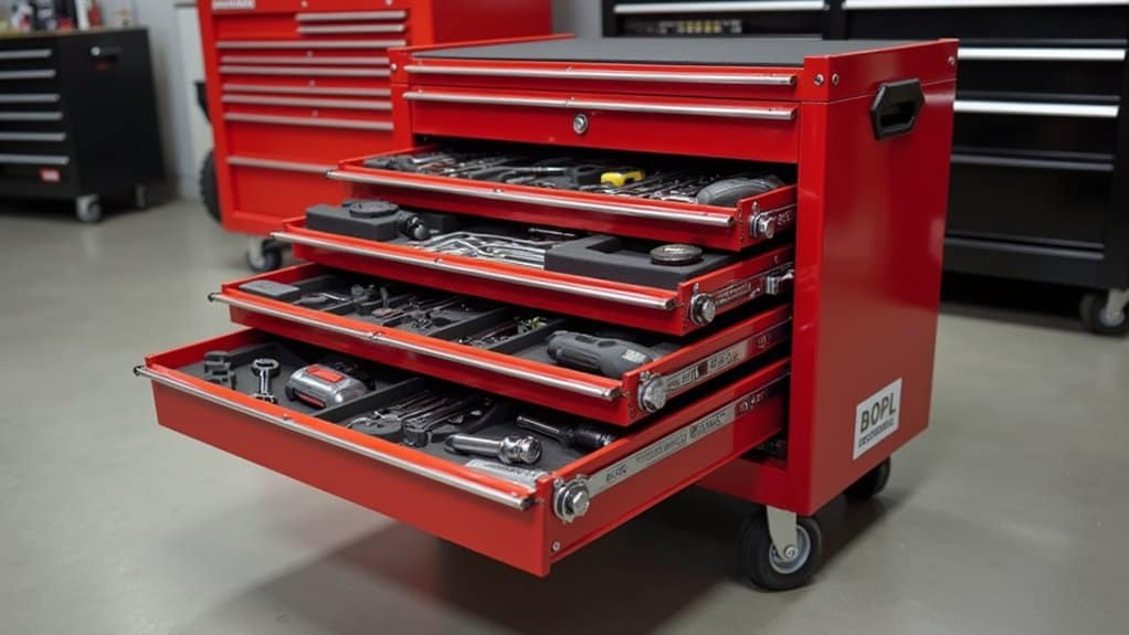 Adjustable drawer dividers are an excellent solution for keeping your garage drawers organized and clutter-free. Start by measuring the dimensions of your drawers to select dividers that fit snugly, guaranteeing they can be adjusted to accommodate various tools and items. Install the dividers by following the manufacturer’s instructions, typically involving sliding or snapping them into place, and customize the compartments based on the size and shape of your gear, such as screwdrivers, wrenches, or small hardware.