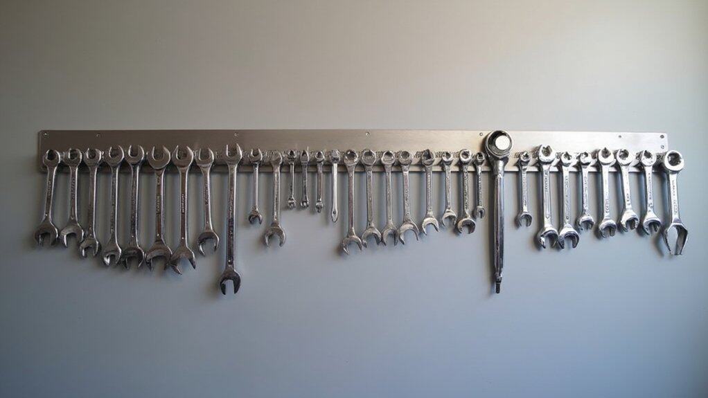 Magnetic tool holders are an excellent solution for keeping frequently used tools organized and easily accessible in your garage. Start by selecting a sturdy magnetic strip or bar that can hold the weight of your tools, and mount it securely on a wall or the side of a workbench where you can reach it without obstruction. Guarantee the area is free of clutter to prevent any interference with the magnetic hold, and arrange your tools like screwdrivers, pliers, and wrenches in a way that prioritizes the ones you use most often.