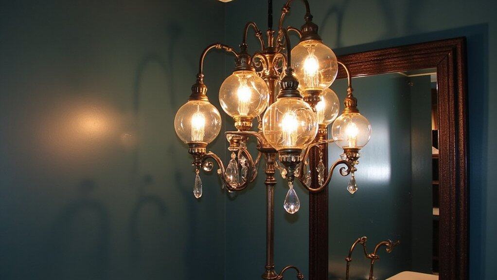 Moving from vintage faucets to another bold design choice, consider swapping out your powder room’s lighting for an eclectic light fixture. It’s a quick way to make a statement in a small space. Choose a fixture that mixes styles, like industrial metal with bohemian glass, and aim for a size around 12-18 inches wide to fit most powder rooms.