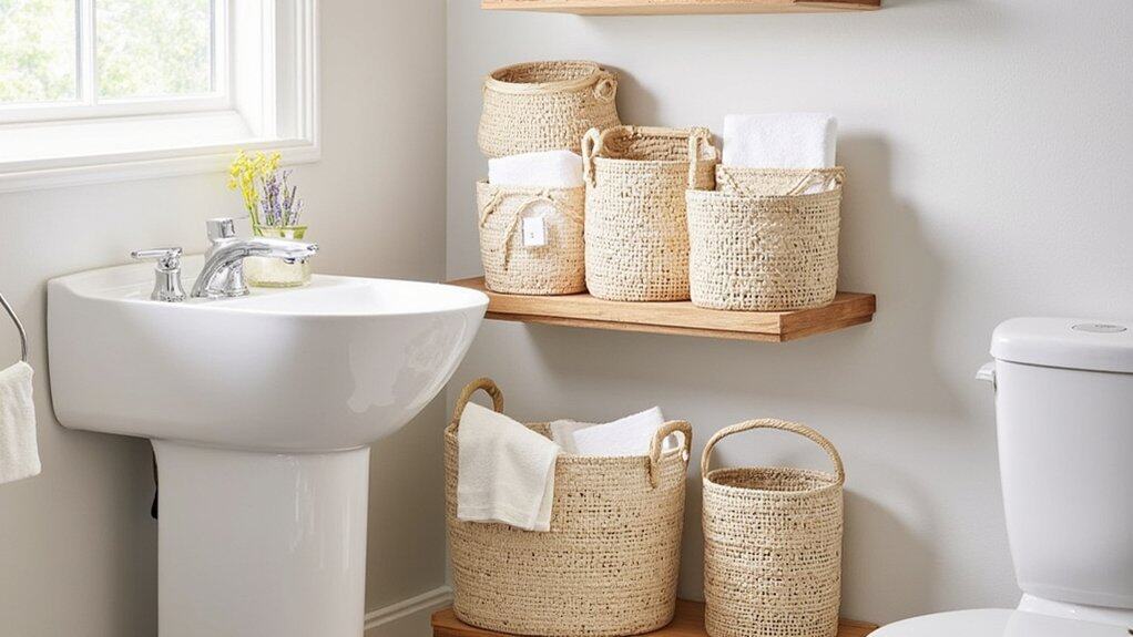 Let’s shift gears from sprucing up with a shower curtain to enhancing your powder room’s charm with storage baskets. These handy items aren’t just functional; they add style too. You can tuck away towels and toiletries while keeping the space tidy.