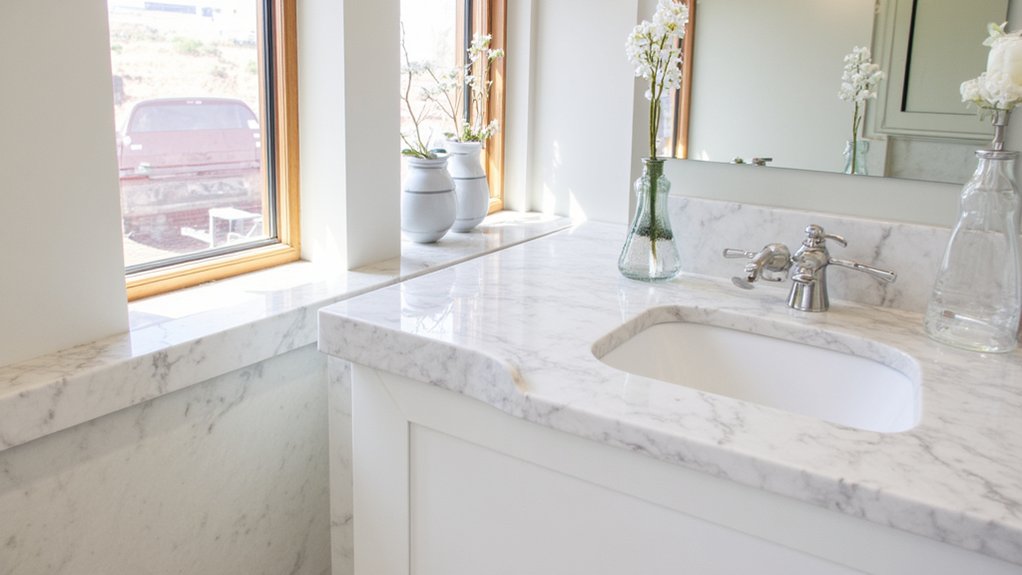 While transforming your bathroom into a luxurious haven, consider upgrading to a marble countertop for an instant elegance boost. Marble’s natural veining and polished finish scream sophistication. You’ll love how it elevates your space instantly.