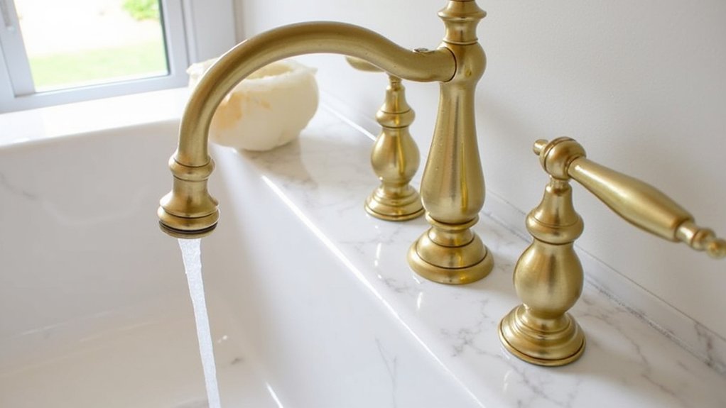 As you enhance your bathroom’s luxurious vibe, consider installing gold-plated faucet fixtures for a striking touch of opulence. They’re an easy way to elevate your space with a rich, elegant look. Imagine turning on a 24-karat gold-plated faucet—it’s pure sophistication!