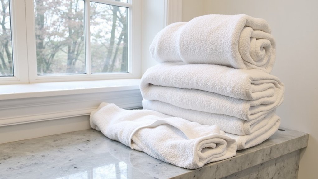 Comfort starts with the right bath towels, and plush options can transform your daily routine into a spa-like experience. You’ve gotta pick towels that feel soft and soak up water fast. Go for 100% cotton with a weight of 600-800 GSM (grams per square meter) for max fluffiness.