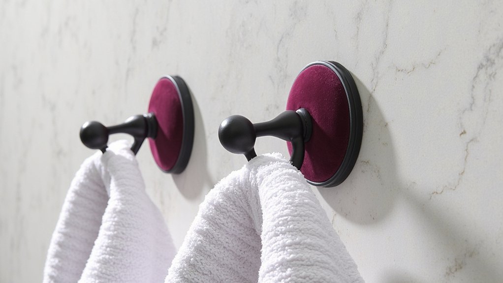 Moving from the gleam of gold-plated faucets, let’s focus on adding a plush touch with a velvet bathrobe hook. You can elevate your bathroom’s vibe with this small, luxe detail. Install it near your bath for easy access.