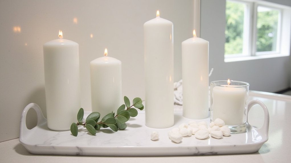 How can you turn your bathroom into a calming retreat with just a small touch? Add scented spa candles to create a soothing vibe instantly. Place them strategically for maximum effect.