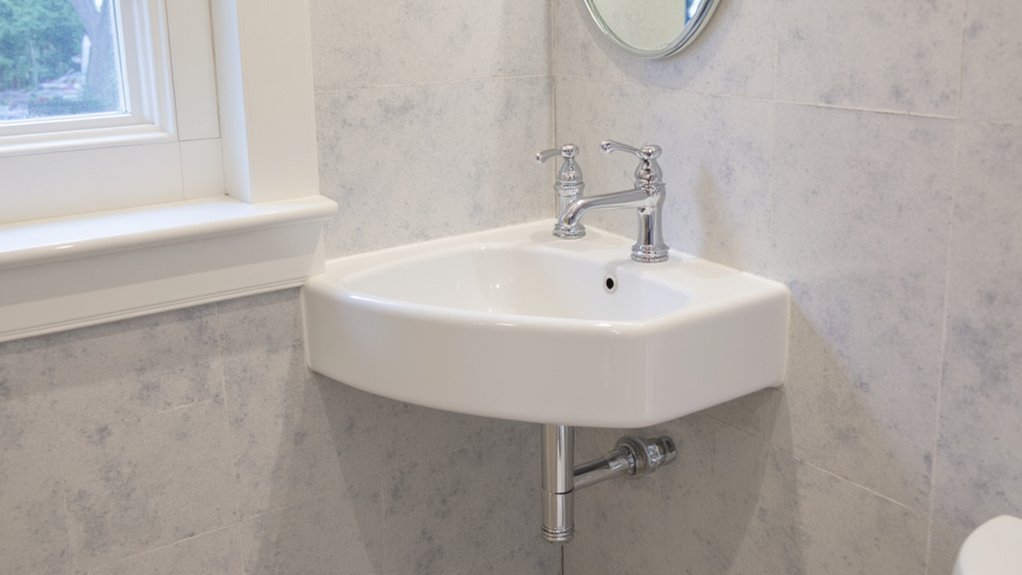 Moving from the sleek undermount sink, consider a bold corner sink to make the most of your guest bathroom’s layout. It’s a smart pick for tight spaces, often fitting into a 24-inch by 24-inch corner. Install it in just a weekend with basic tools.