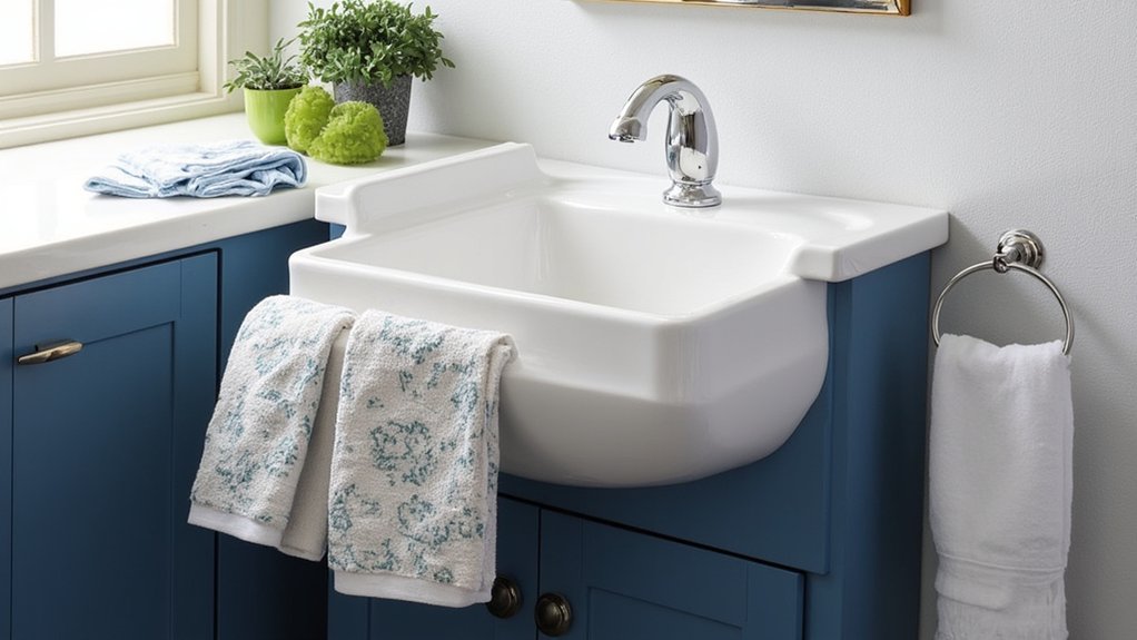 A compact apron sink can bring a charming, farmhouse touch to your guest bathroom with surprising functionality. You’ll love how this small sink, often 24-30 inches wide, fits snugly into tight spaces while offering a deep 8-inch basin for easy use. It’s perfect for quick handwashing or rinsing.