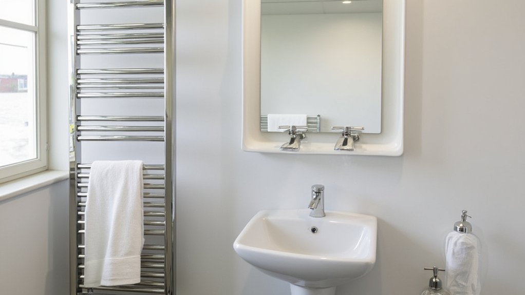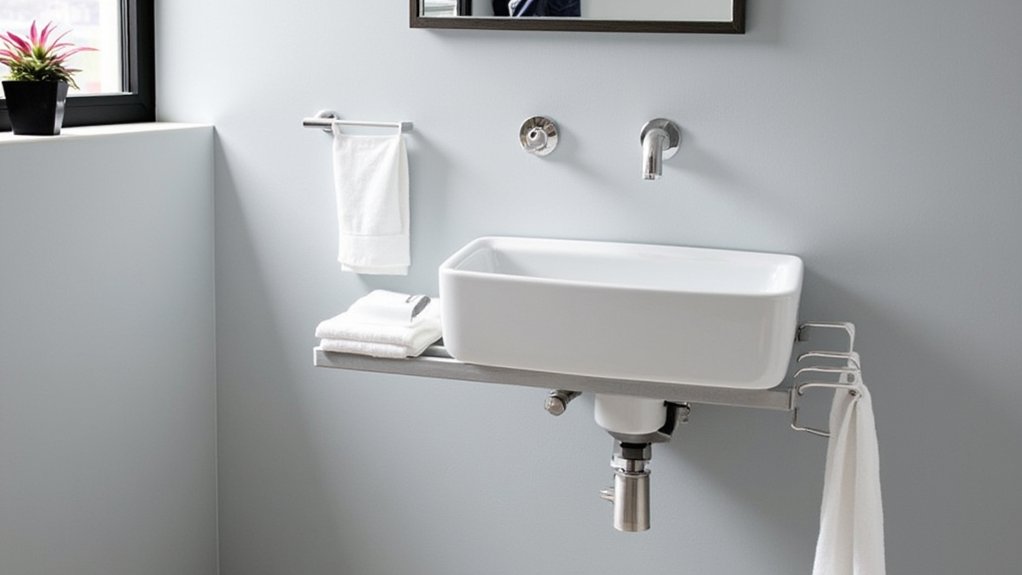 Shift your focus to a stylish floating sink for a guest bathroom that screams modern charm and space-saving design. You’ll love how it mounts directly to the wall, freeing up floor space in tight areas. Typically, these sinks measure around 24-36 inches wide, fitting snugly in small spaces.