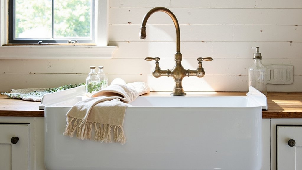 Let’s shift focus to another standout option for your guest bathroom: the rustic farmhouse sink. You’re choosing a style that’s warm and inviting with its deep, wide basin—often 30 inches wide and 10 inches deep. It’s perfect for a cozy, country vibe.