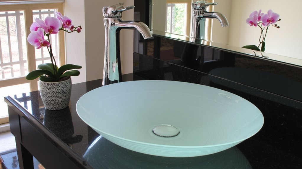 While upgrading your guest bathroom, consider installing a unique vessel sink to make a striking impression. These sinks, typically 16-20 inches in diameter, sit atop the counter, offering a bold look. You can install one in about 2-3 hours with basic tools.