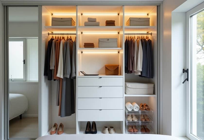 Strategic placement of hooks and racks not only maximizes storage but also creates a visually appealing display of your belongings. This organization method works particularly well for frequently used items that you need to grab quickly, while simultaneously protecting delicate items from being crushed or wrinkled in drawers.