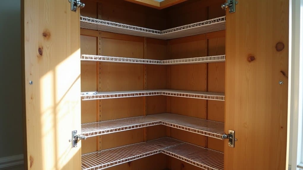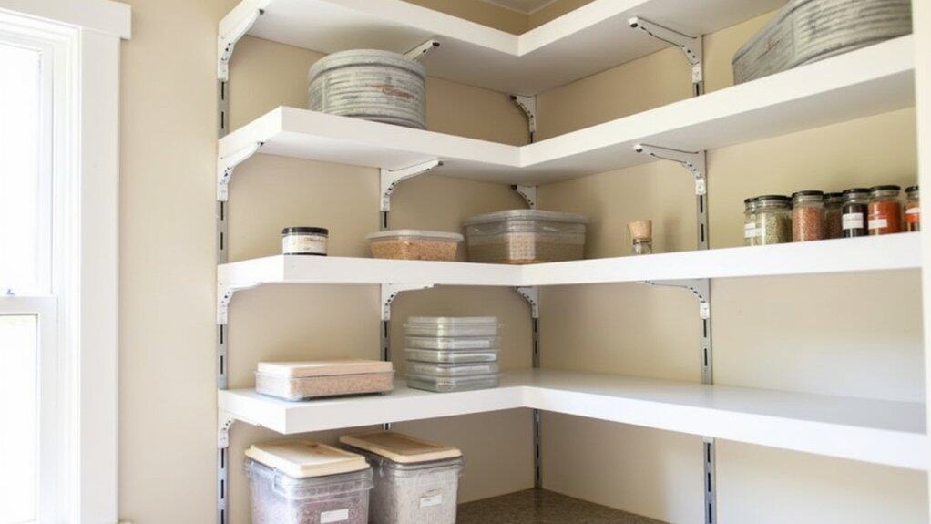 Installing adjustable shelving units is a game-changer for pantry organization, allowing you to customize storage based on your needs and the size of items you store. Begin by measuring the dimensions of your pantry space to determine the appropriate size and number of shelving units required. Choose adjustable shelves made of sturdy materials like metal or heavy-duty plastic to guarantee durability and support for heavier items such as canned goods or appliances. Install the units according to the manufacturer’s instructions, typically by securing brackets or tracks to the wall, then slotting the shelves into place at desired heights.