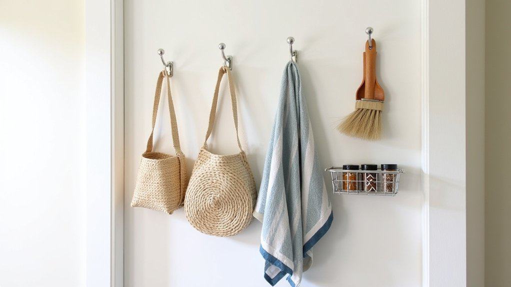 Hanging hooks can be a game-changer for maximizing pantry storage, especially in tight spaces where every inch counts. Install hooks on the inside of pantry doors or along unused wall space to create additional hanging spots for lightweight items like aprons, reusable bags, or even small baskets holding snacks or spices. Opt for sturdy, adhesive hooks or screw-in options depending on the surface and weight of the items you plan to hang, guaranteeing they can support the load without damaging the door or wall. This approach not only frees up shelf space but also keeps frequently used items within easy reach for quick access.