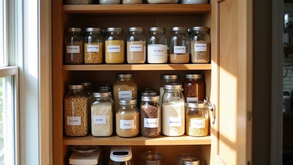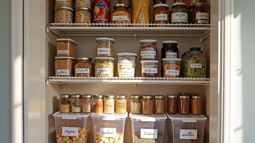 To maintain this system, consider the frequency of use when deciding where to place each category, keeping everyday items at eye level for quick access. Less frequently used items, like specialty baking ingredients or bulk goods, can be stored on higher or lower shelves. Use clear containers or baskets to keep smaller items contained and visible, preventing clutter from building up over time. Finally, establish a routine of returning items to their designated categories after use to guarantee the organization system remains effective.