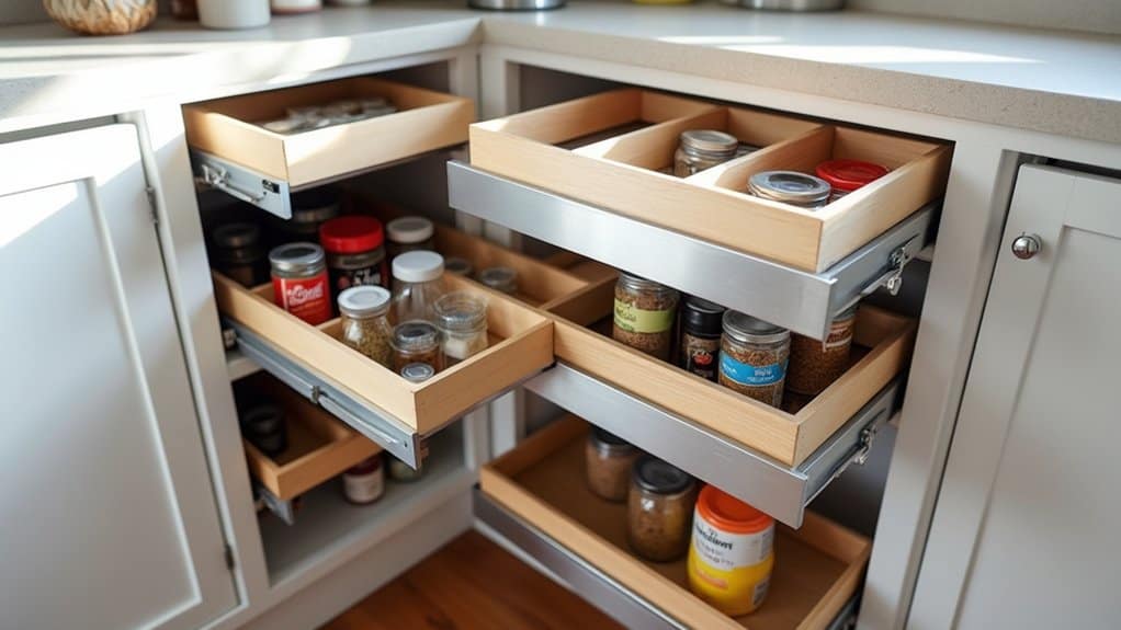 Pull-out drawers and trays are game-changers for pantry organization, offering easy access to items that might otherwise get lost in the back of deep shelves. Begin by evaluating the space in your pantry to determine where pull-out mechanisms can be installed, focusing on lower shelves or cabinets where visibility is often limited. Choose sturdy hardware that can support the weight of heavier items like canned goods or small appliances, and opt for full-extension slides to guarantee you can reach everything without strain. Measure carefully to confirm the drawers or trays fit snugly, and consider adjustable or customizable options to accommodate different item sizes.