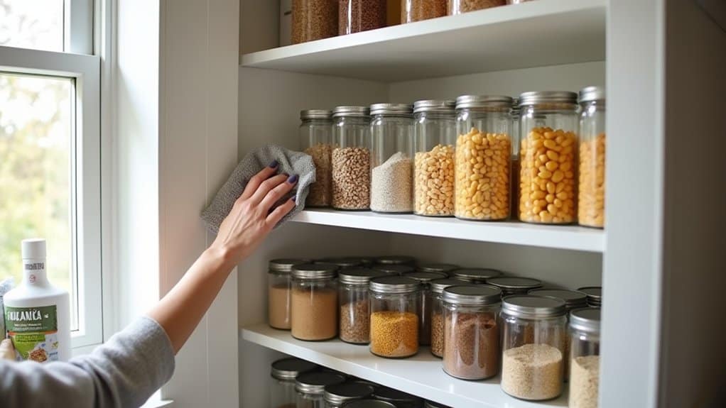 Beyond a set schedule, make tidying a daily habit by adopting simple practices after each grocery trip or meal prep. Take a moment to group like items together, guarantee labels face forward for easy visibility, and check if anything needs restocking. If something spills, clean it up immediately to avoid attracting pests or creating a mess that hardens over time. These quick, mindful actions help maintain a functional and orderly pantry without requiring much effort.