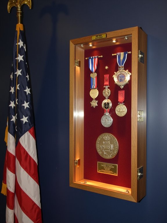 The ideal showcase measures 24″ x 36″ and mounts securely to the wall. LED lighting illuminates each medal’s intricate details, while individual plaques beneath describe the awards’ significance and dates received. This thoughtful organization system preserves military history while paying proper tribute to a veteran’s service achievements.