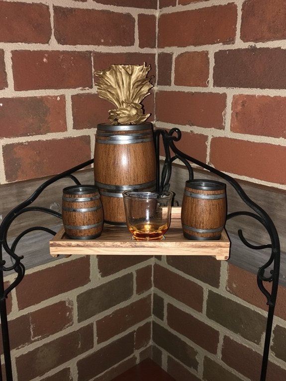 A mini bourbon barrel display serves as an eye-catching centerpiece for any home bar or entertaining space. The authentic wooden barrel, typically sized at 2-3 gallons, adds rustic charm while creating an engaging conversation piece that celebrates bourbon heritage and craftsmanship.