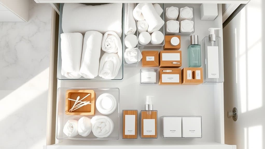 Start by removing all items from cupboards and drawers, grouping similar items together (toiletries, first aid, cleaning supplies, etc.). Measure your drawer and cabinet spaces, then select appropriately sized clear bins and dividers that maximize the available space.