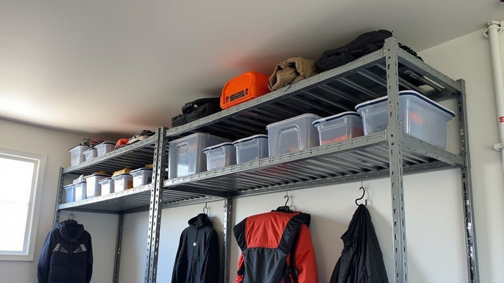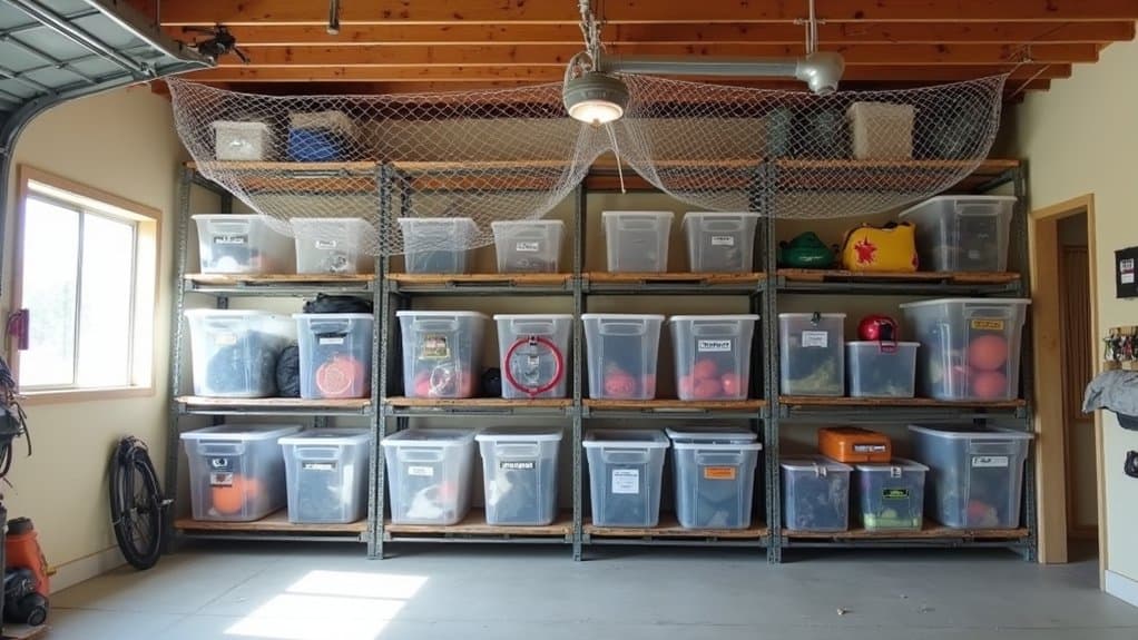 To effectively organize with ceiling storage nets, categorize the items you plan to store, such as holiday decorations, camping gear, or sports equipment, and use clear, labeled bins or bags for easy identification. Verify that heavier items are placed centrally in the net to distribute weight evenly and avoid overloading any one area. Always follow safety guidelines by not exceeding the net’s weight limit and regularly inspecting the anchors and netting for signs of wear or damage to maintain a secure storage solution.