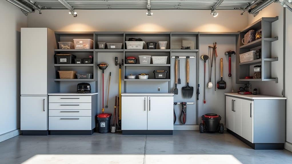 Installing corner storage units can help declutter your garage by providing dedicated spots for tools, sports equipment, or seasonal items. Secure the units to the wall for safety, especially if storing heavy items, and organize contents by frequency of use, placing everyday essentials within easy reach. Label shelves or bins to maintain order and guarantee everything has a designated place, making retrieval quick and efficient.